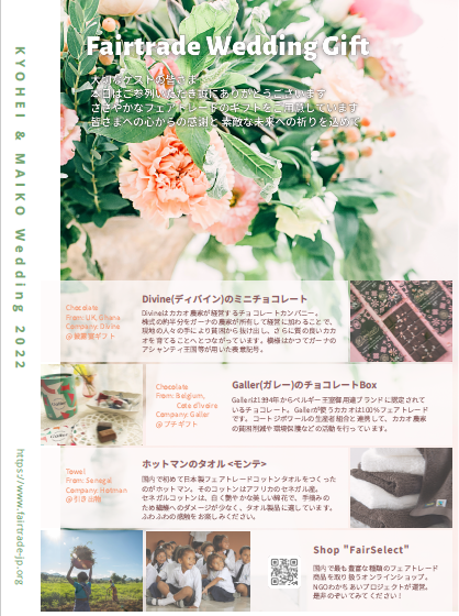 披露宴の中で配ったフェアトレード商品について解説のオリジナルチラシをつくって、引き出物袋に入れておきました。商品の背景のストーリーを知ってもらいたくて。Canvaというアプリで簡単におしゃれなデザインをつくれて有難かったです。