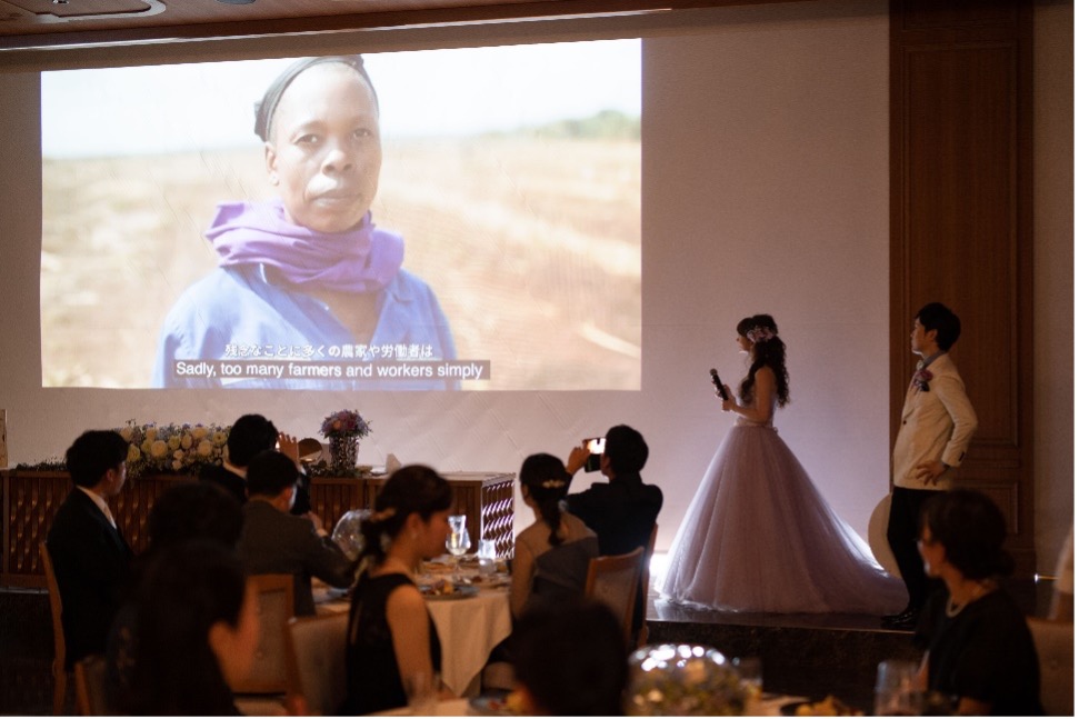 テーブルラウンドの後は、新郎新婦からのプレゼンテーションコーナー!ということで、夫と一緒にフェアトレードについて説明しました笑。実はこれは夫の発案で、事前に内容も一緒に考えてくれたことは私にとって嬉しかったことの一つです。彼自身も「いまお手元に配ったチョコレート、実は…」とノリノリで話してくれました。フェアトレードのプロモーション動画を流している間は、披露宴会場が一瞬セミナー会場に見える、少々シュールな状態でした笑。
