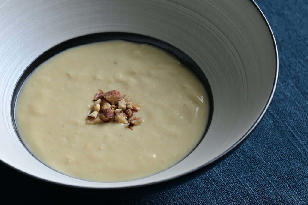 ポルチーニとじゃがいも、玉ねぎを野菜出汁で煮込み、最後に豆乳を加えてクリームスープに仕上げました。