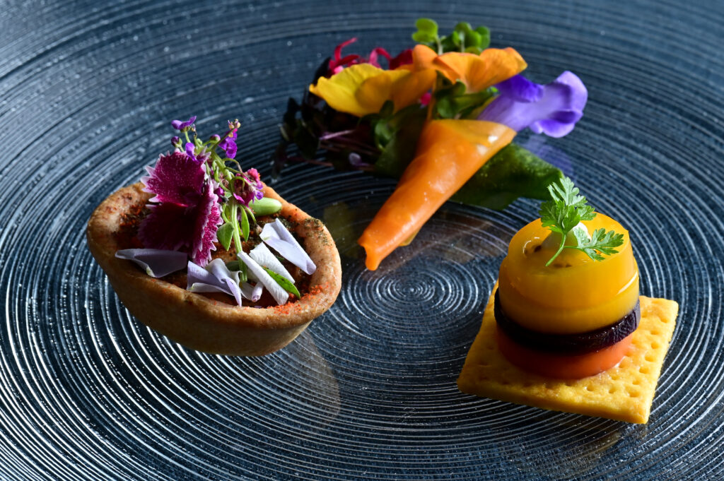アミューズに「ガーデンサラダ」、前菜には「ブーケサラダ・にんじんのカナッペ・キッシュ」の前菜3種盛り合わせ、スープは「ポルチーニの豆乳クリームスープ」をご用意。温前菜には、マッシュルームをアレンジして作った「マッシュルームガーデン」。