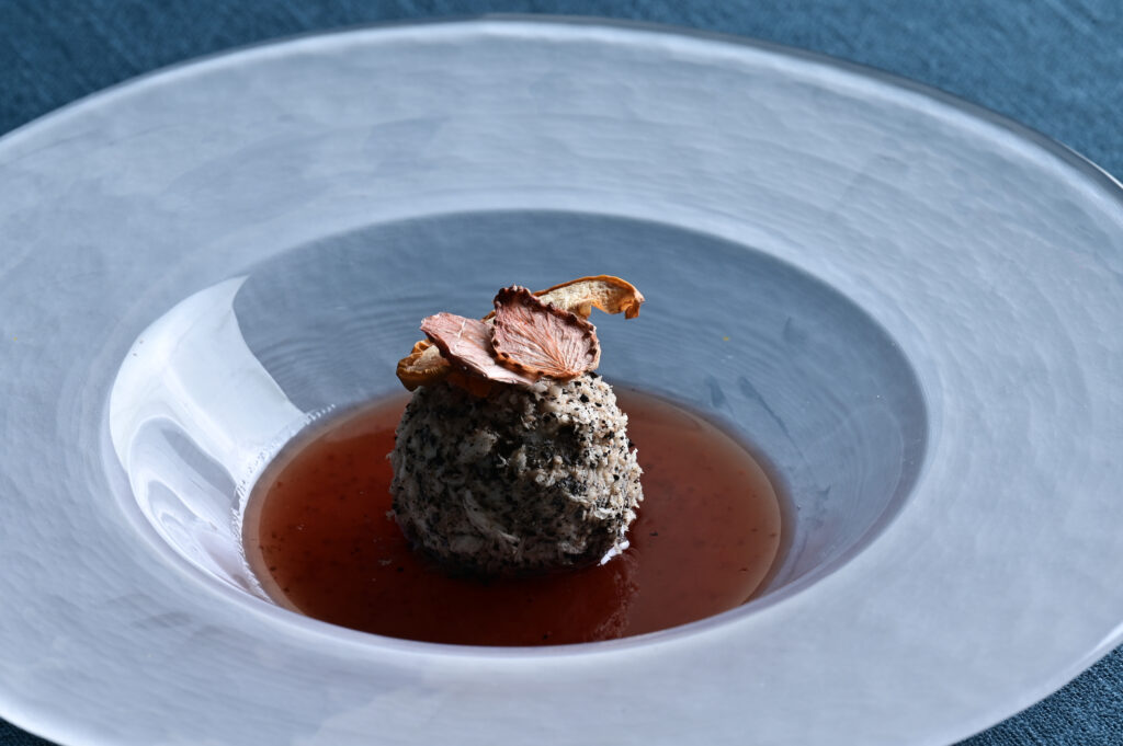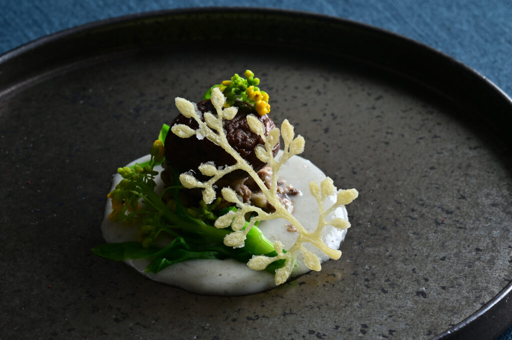 ビーツのソースの上にのせた蓮根の中には、豆乳、ラー油、ハーブの香りが
